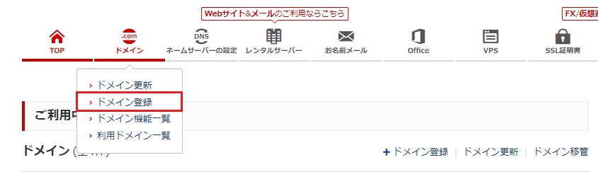 お名前.comにログインし、「ヘッダー→ドメイン→ドメイン登録」と操作します。