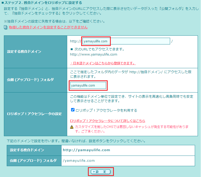 下記赤枠の場所に先ほど取得したドメインを入力し、「独自ドメインをチェックする」ボタンをクリックします。すると一番下に「設定する独自ドメイン」と「設定」ボタンが表示されるのでクリックします。