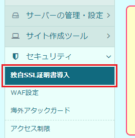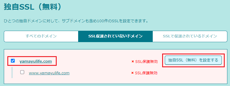 サイドバーから「セキュリティ→独自SSL証明書導入」を選択します。遷移先のページの下のほうへ行くと、「独自SSL(無料)」という欄があり、さきほど登録したドメインが表示されていると思います。ここでチェックをつけ、「独自SSL(無料)を設定する」ボタンをクリックします。