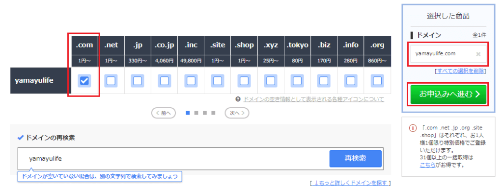 画面右側の「選択した商品」の欄で使いたいドメインが選択させていることを確認して、「お申込みへ進む」をクリック。