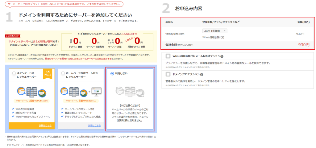 今回はお名前.comではドメインを取得するだけなので、1.は「利用しない」を選択。2.お申込み内容を確認して、画面右上の「次へ」をクリック。