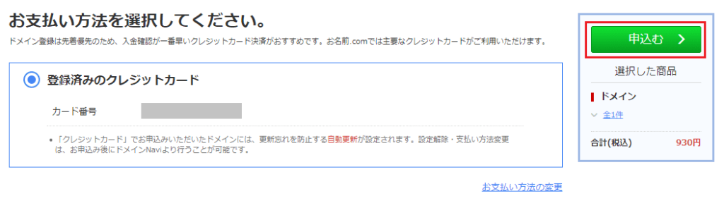 支払方法を選択して「申し込む」をクリック。