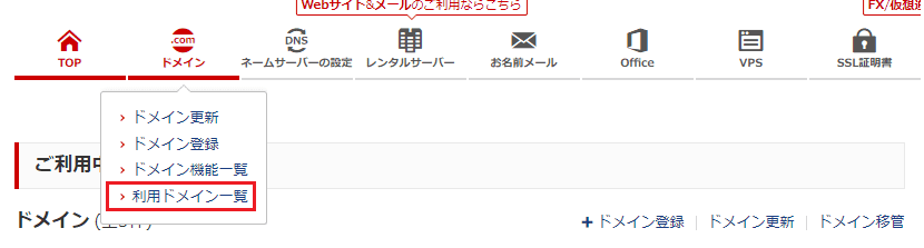 お名前.comにログインし、「ヘッダー→ドメイン→利用ドメイン一覧」と操作します。