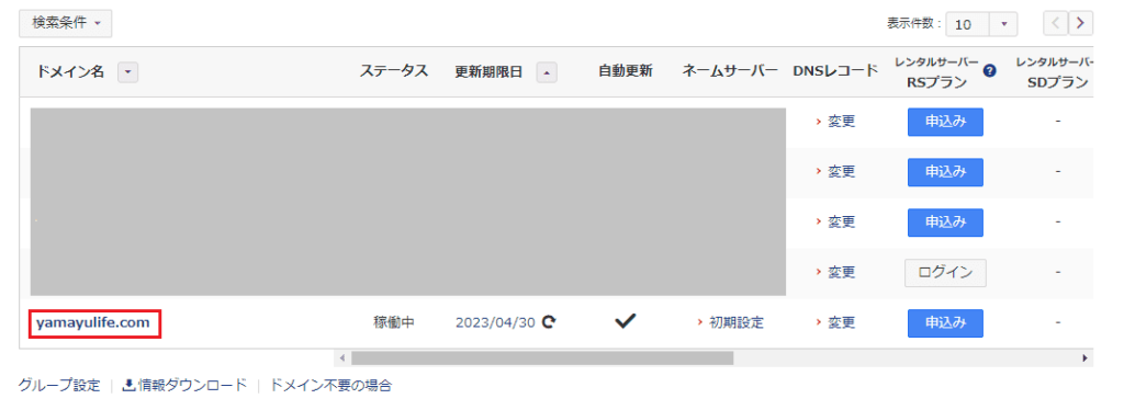 すると先ほど登録したドメインが表示されるのでクリックします。