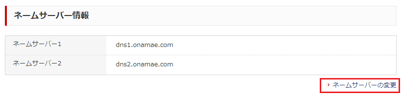 遷移先のページで下のほうに行くと「ネームサーバ情報」があると思います。これがどこのDNSサーバを使うか、という情報になります。初期値では「~.onamae.com」なので、お名前.comのDNSサーバを使うようになっていることが分かります。