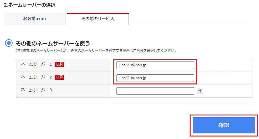 「2.ネームサーバーの選択」で、「その他のサービス」のタブを選択します。するとネームサーバ情報を記載することができるので、ネームサーバ1と2をそれぞれ「uns01.lolipop.jp」「uns02.lolipop.jp」として、「確認」ボタンをクリックします。